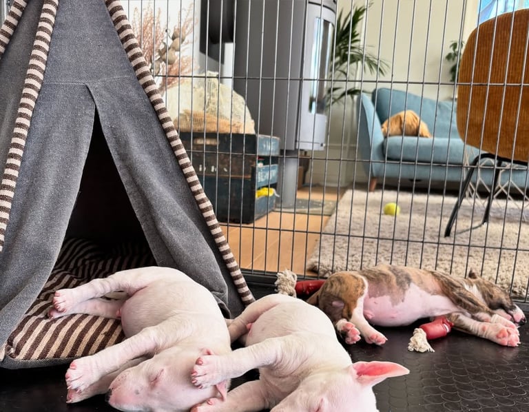Discover the strength, elegance, and loyalty of our Bull Terriers, raised in a loving home environment dedicated to their health, temperament, and companionship.